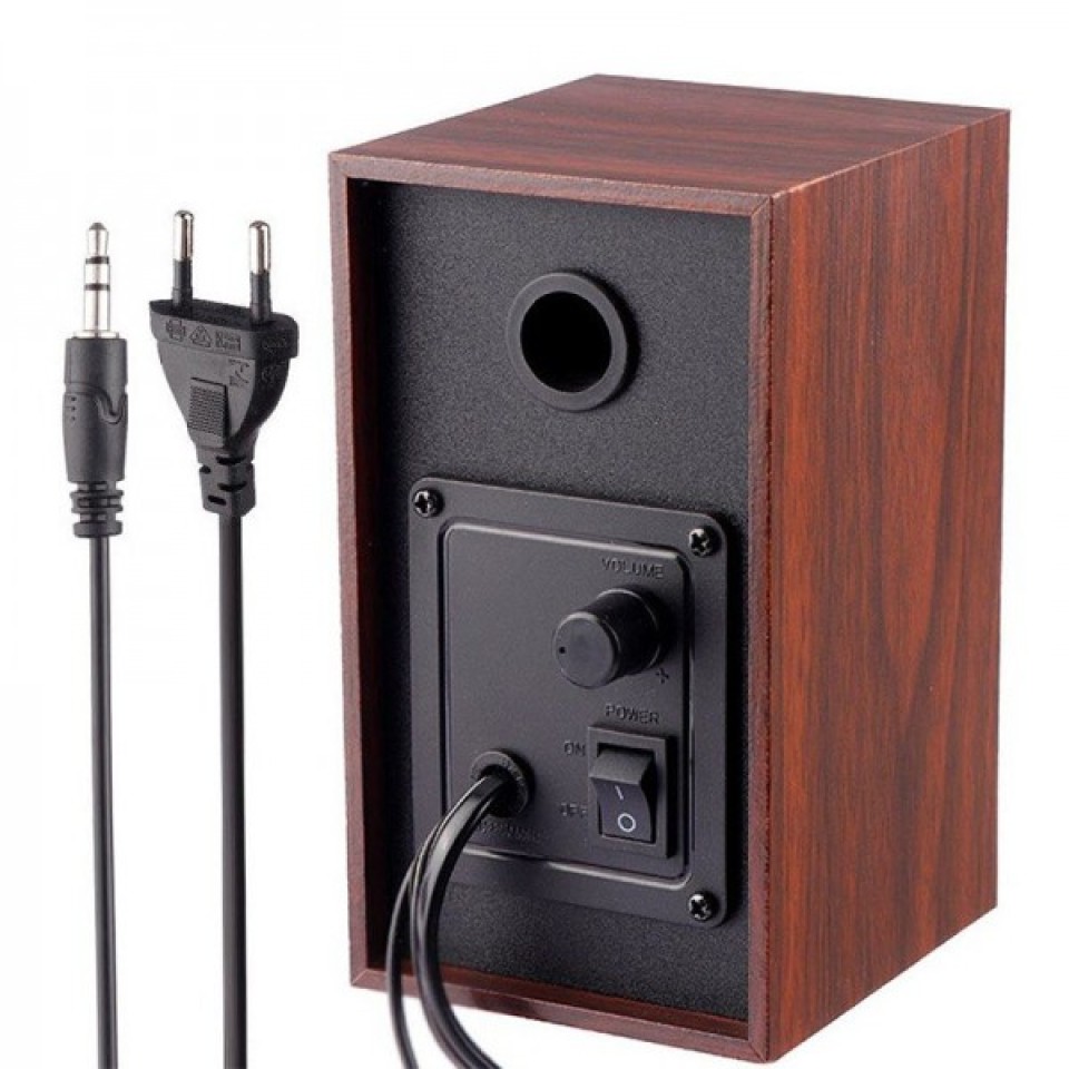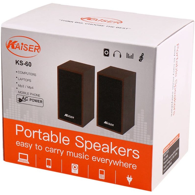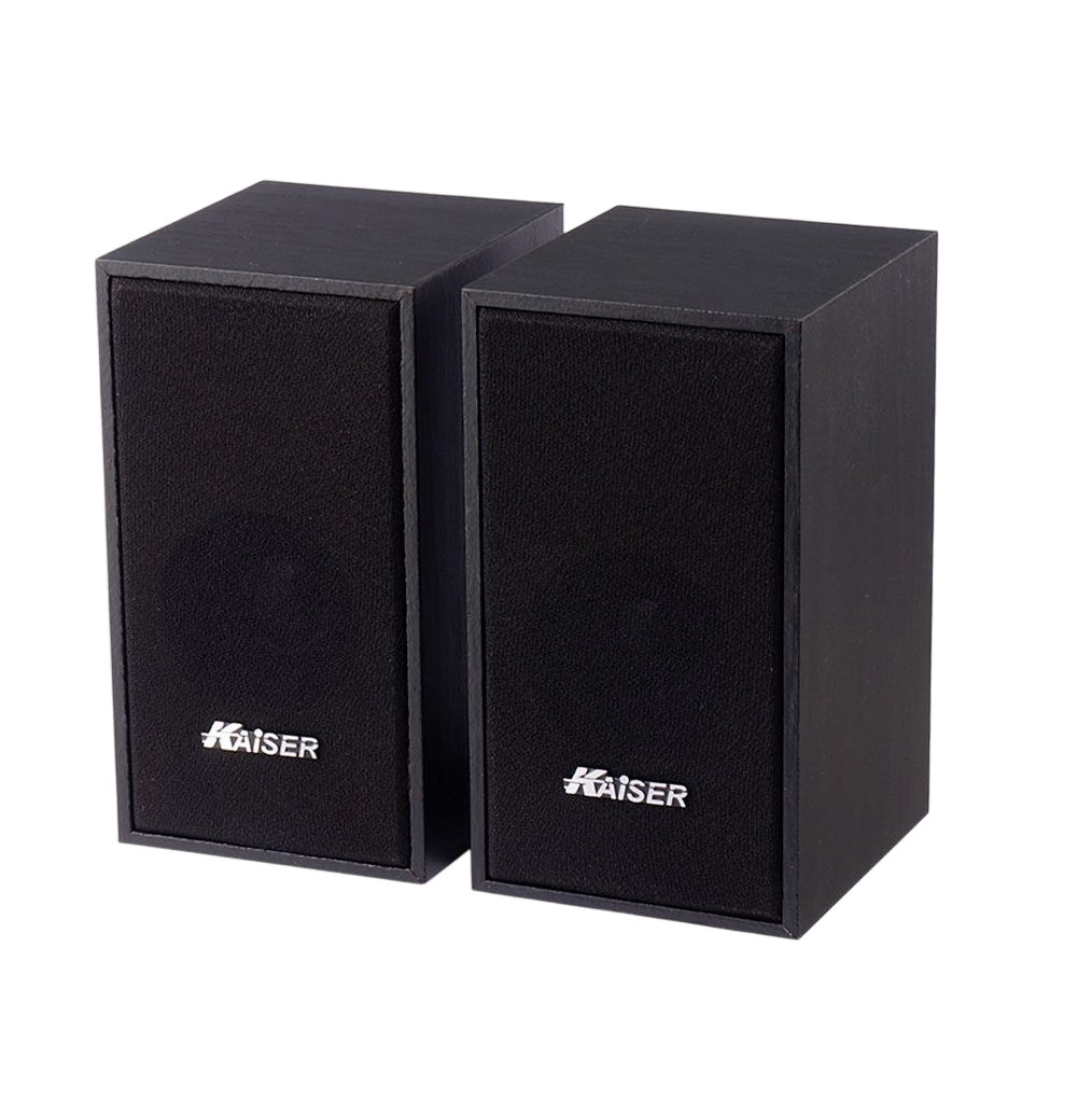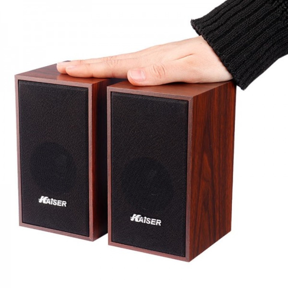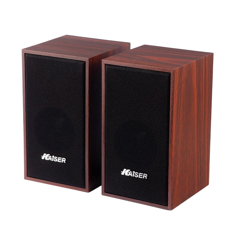 اسپیکر دو تکه کایزر مدل Kaiser KS-60 قابل اتصال به لپ تاپ و سیستم های کامپیوتری دسکتاپ، مجهز به کلید فیزیکی جهت خاموش/ روشن کردن و تنظیم ولوم اسپیکر، پشتیبانی از فرمت های MP3 و MP4، دارای میزان حساسیت برابر با 60 دسی بل، اتصال باسیم از طریق رابط جک 3.5 میلی متری صدا، تامین انرژی توسط دوشاخه برق، بدنه خوش ساخت در ابعاد جمع و جور با طراحی زیبا مناسب برای قرارگیری روی میز و …، شامل 2 اسپیکر مجزا با توان خروجی کلی 6 وات(2*3) و نسبت سیگنال به نویز برابر با 70 دسی بل، ساخته شده از جنس پلاستیک و چوب باکیفیت، مقاوم در برابر آسیب های فیزیکی همچون ضربه و فشار، میزان پاسخ فرکانسی برابر با 85 هرتز الی 18 کیلوهرتز، ولتاژ ورودی برابر با 230 ولت و فرکانس ورودی برابر با 50 هرتز