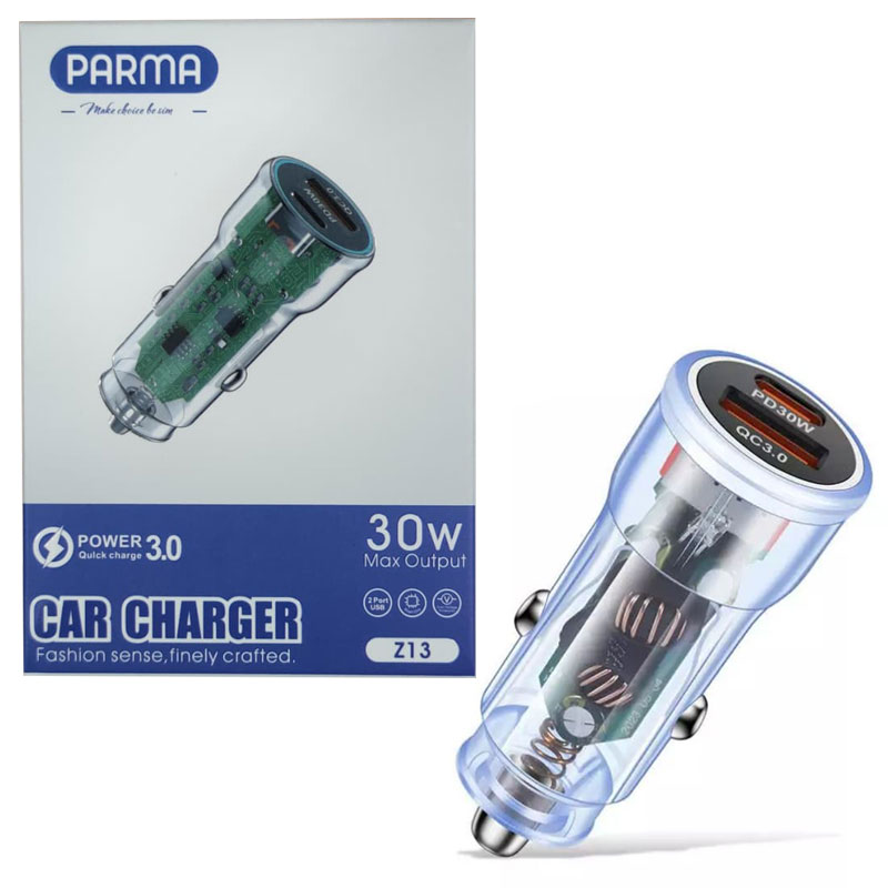 شارژر فندکی پارما مدل Parma Z13 با ظاهر شفاف و زیبای خود دارای یک خروجی تایپ سی با توان 30W و یک خروجی USB 18 وات میباشد. همچنین این فندکی با پشتیبانی از فناوری PD و QC3.0 قابلیت شارژ همزمان دو دستگاه را دارد.