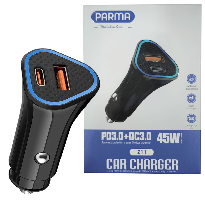 شارژر فندکی پارما مدل Parma Z11 دارای یک خروجی تایپ سی با توان 30W و یک خروجی USB 15W وات میباشد که حداثر توان خروجی 45W را دارد. همچنین این فندکی با پشتیبانی از فناوری PD و QC3.0 قابلیت شارژ همزمان دو دستگاه را دارد.