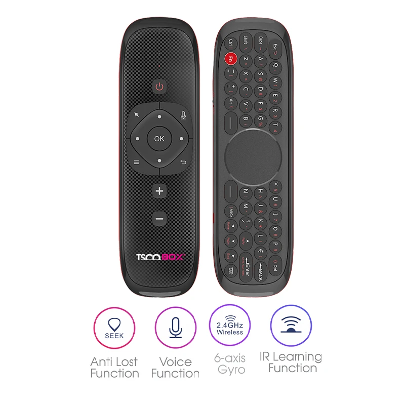 کنترل هوشمند تسکو مدل TSCO TRC 191 این محصول از 4 کاربرد ریموت کنترل، مینی کیبورد، تاچ پد (جهت اسکرول) و ایرموس بهره می برد که برای استفاده در انواع تلویزیون های هوشمند، اندروید باکس، پروژکتورها و همچنین سیستم عامل های ویندوز، اندروید، لینوکس و مک مناسب می باشد. ایرموس TRC 191 دارای بدنه ای از جنس پلاستیک مقاوم ABS و سیلیکون می باشد که از کیفیت بسیار مناسبی بهره می برد و به لطف طراحی ارگونومیک به راحتی در دستان شما جای می گیرد. این محصول با استفاده از روکش مات و براق در کنار یکدیگر از ظاهر جذابی برخوردار بوده و در کنار زیبایی دارای استحکام بالایی در برابر آسیب های احتمالی نظیر ضربه و فشار است. اتصال ریموت هوشمند TRC191 به سایر دستگاه ها به صورت وایرلس می باشد که توسط دانگل USB با برد 10 متر و فرکانس 2٫4 گیگاهرتز انجام می گیرد. TSCO Air Mouse TRC 191 به لطف پشتیبانی از تکنولوژی IR Learning با ریموت کنترل های دیگر به راحتی قابل همسان سازی بوده و از قابلیت Anti Lost (ریموت یاب) پشتیبانی می کند. ایرموس تلویزیون های هوشمند تسکو مدل TRC191 قابلیت استفاده به صورت افقی و عمودی را داشته و به صورت دو طرفه طراحی شده است. در یک طرف این دستگاه کلید های جستجوگر صوتی، کلیدهای مجزا جهت نما، ولوم صدا و… تعبیه شده و در سمت دیگر کیبورد و تاچ پد (جهت اسکرول) قرار دارد. کیبورد تعبیه شده بر روی این کنترلر دارای 59 کلید بوده که از دارای چیدمان مناسبی برخوردار می باشد و به خوبی نیاز های کاربران در زمینه چت، ارسال ایمیل، وب گردی و … را برآورده خواهد نمود. کنترلر هوشمند TRC 191 از یک میکروفن برای دریافت دستورات صوتی بهره می برد و از قابلیت تنظیم CPI (تنظیم حساسیت ایرموس) پشتیبانی می کند. ایرموس TSCO برای تامین انرژی خود مجهز به یک باتری لیتیوم 500 میلی آمپری می باشد که از شارژدهی خوبی بهره می برد. این دستگاه برای شارژ شدن مجهز به یک پورت Micro USB بوده و برای رسیدن به شارژ کامل به 3 الی 4 ساعت زمان نیاز دارد.