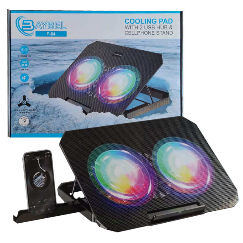 کول پد بایبل مدل Baybel F-64 خنککنندگی قدرتمند با دو فن بزرگ 14 سانتی متری، جریان هوای یکنواخت و قدرتمندی را برای دفع سریع حرارت از زیر لپتاپ فراهم میکنند و عملکردی بیصدا دارند.