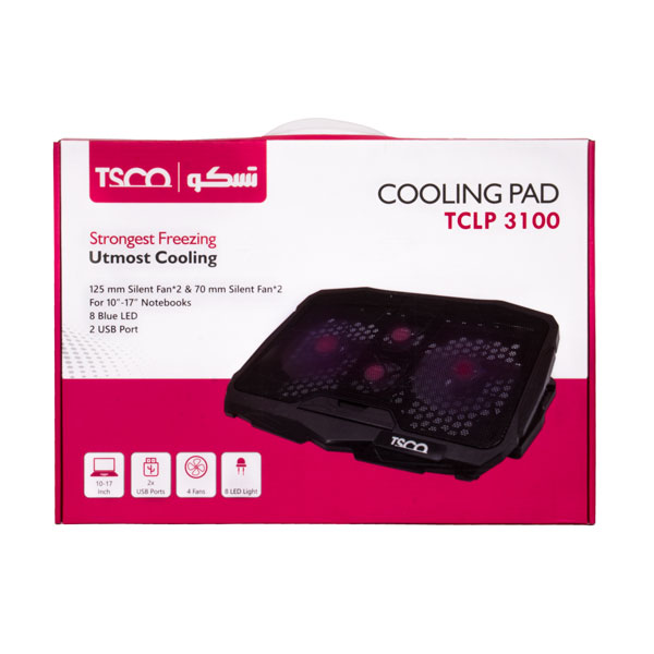 کول پد تسکو مدل TSCO TCLP 3100با 4 فن قدرتمند (2 عدد فن با قطر 12.5 سانتی متر و 2 عدد 7 سانتی متری)، دارای کلید کنترل سرعت فن، تنظیم ارتفاع در 5 سطح، نورپردازی LED، دو پورت USB و طراحی مقاوم فلزی، گزینهای ایدهآل برای خنکسازی و راحتی طولانیمدت کاربران حرفهای تا لپتاپهای 17 اینچی است.